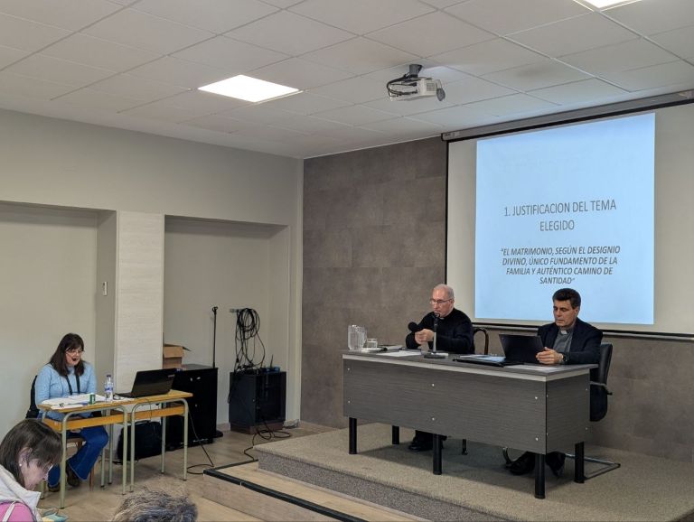 Tras el rosario familiar de la tarde del sábado, tuvo lugar el acto de defensa de tesina a cargo de Dña. Beatriz Martínez Sáez, con el título ¨El matrimonio, según el designio divino, único fundamento de la familia y auténtico camino de santidad¨. Tras la exposición del tema, la alumna respondió a las preguntas del tribunal conformado por el director académico del Diploma en Pastoral Familiar, el Padre Juan de Dios Larrú, y del profesor D. Fernando Simón.
